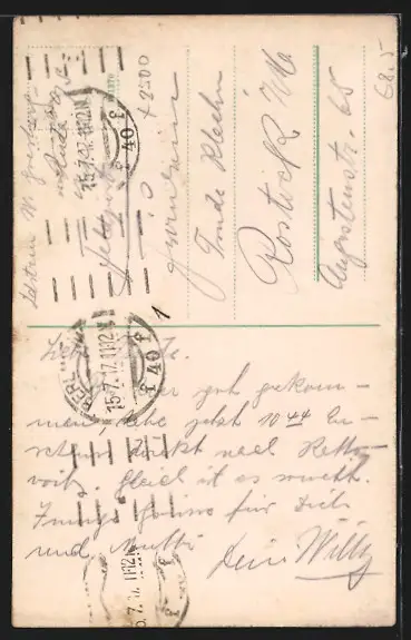 Personenbezogene Daten auf der Rückseite der Karte wurden durch blauen Textmarker unkenntlich gemacht. Die blauen Stellen sind auf die Vorderseite durchgeweicht und wirken sich negativ auf das Postkartenfoto aus