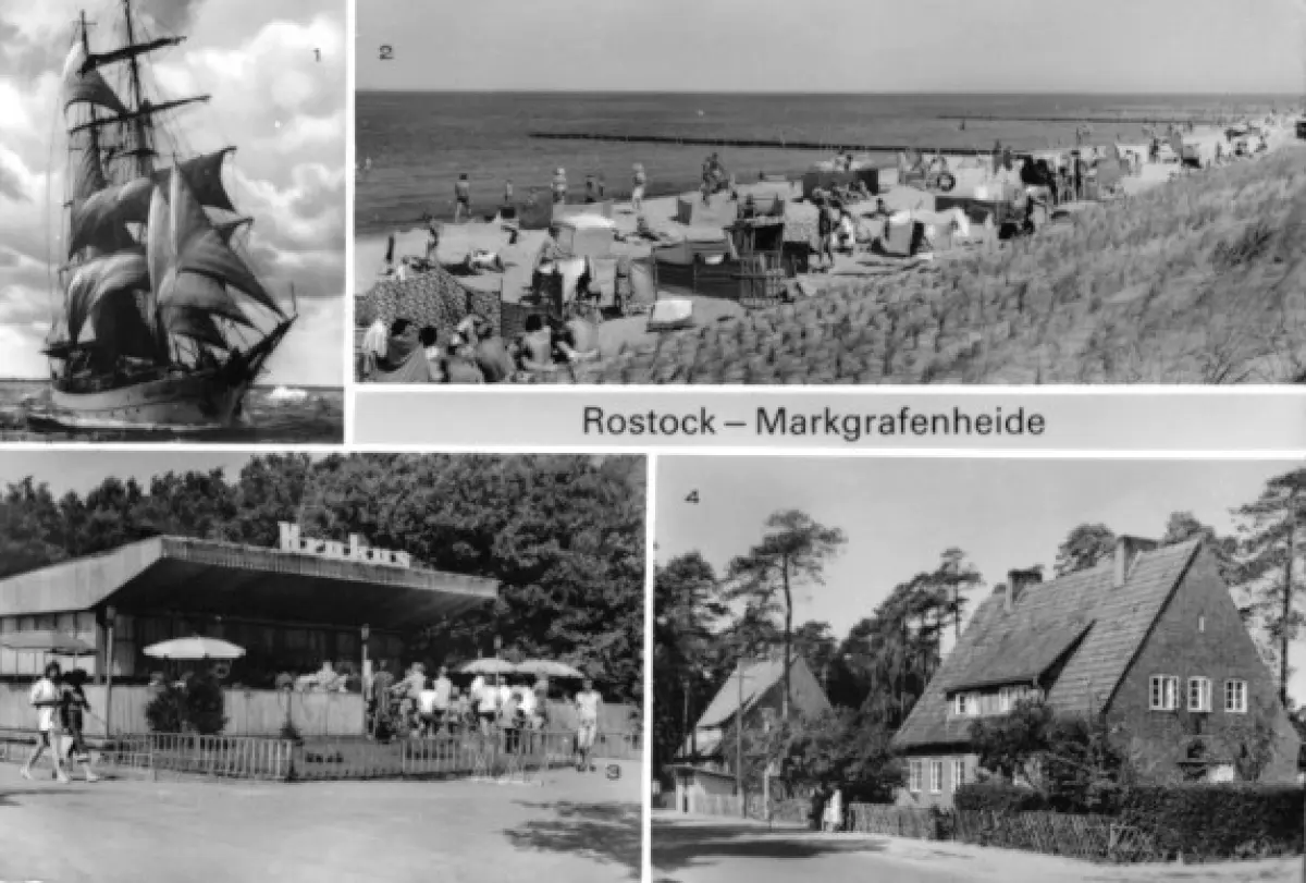 Ansichtskarte Rostock Markgrafenheide vier Abb. - Segelschulschiff, Strand, Selbstbedienungsgaststätte "Krakus", Am Buswendeplatz Erhaltung I-II, Beförderungsspuren Druckart: Fotokarte postalisch gelaufen, gestempelt: Rostock, 8.6.81 Druckvermerk: 1980 Herstellungsland: DDR Verlag: Bild und Heimat, Reichenbach i. V. - 01 01 31 591