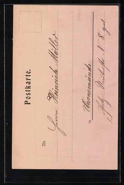 Personenbezogene Daten auf der Rückseite der Karte wurden durch blauen Textmarker unkenntlich gemacht. Die blauen Stellen sind auf die Vorderseite durchgeweicht und wirken sich negativ auf das Postkartenfoto aus
