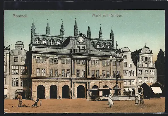 AK Rostock, Markt mit Rathaus u. Strassenarbeitern