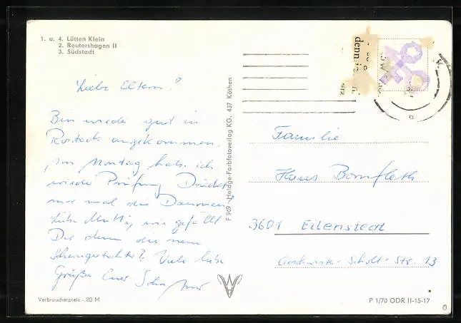Personenbezogene Daten auf der Rückseite der Karte wurden durch blauen Textmarker unkenntlich gemacht. Die blauen Stellen sind auf die Vorderseite durchgeweicht und wirken sich negativ auf das Postkartenfoto aus