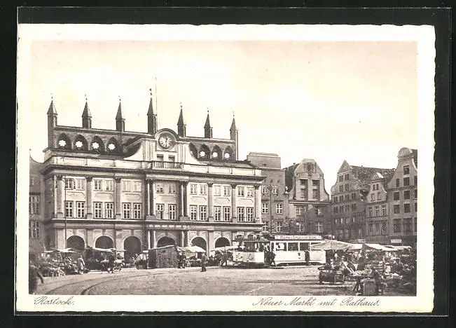 AK Rostock, Neuer Markt mit Rathaus und Strassenbahn