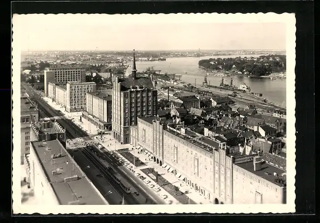 AK Rostock, Ortsansicht mit Hafen aus der Vogelschau