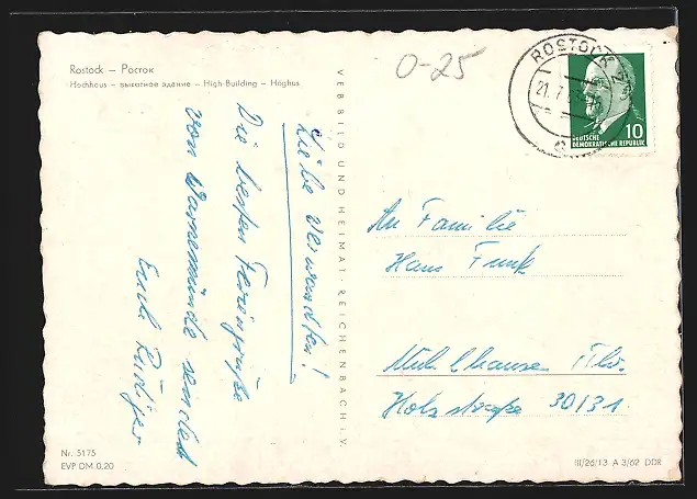 Personenbezogene Daten auf der Rückseite der Karte wurden durch blauen Textmarker unkenntlich gemacht. Die blauen Stellen sind auf die Vorderseite durchgeweicht und wirken sich negativ auf das Postkartenfoto aus