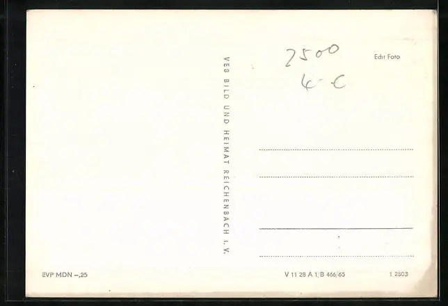 Personenbezogene Daten auf der Rückseite der Karte wurden durch blauen Textmarker unkenntlich gemacht. Die blauen Stellen sind auf die Vorderseite durchgeweicht und wirken sich negativ auf das Postkartenfoto aus