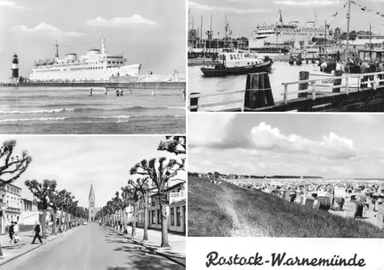 Ansichtskarte Rostock Warnemünde vier Abb. - Fährschiff Warnemünde, Blick zum Fährhafen, Strand, Warnemünde Erhaltung I-II ungelaufen Druckvermerk: 1975 Herstellungsland: DDR Verlag: Planet-Verlag Berlin - 02 01 31 166