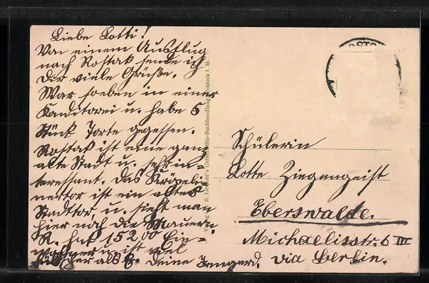 Personenbezogene Daten auf der Rückseite der Karte wurden durch blauen Textmarker unkenntlich gemacht. Die blauen Stellen sind auf die Vorderseite durchgeweicht und wirken sich negativ auf das Postkartenfoto aus