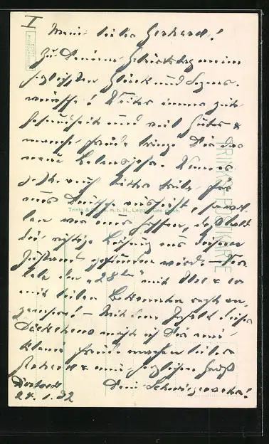 Personenbezogene Daten auf der Rückseite der Karte wurden durch blauen Textmarker unkenntlich gemacht. Die blauen Stellen sind auf die Vorderseite durchgeweicht und wirken sich negativ auf das Postkartenfoto aus
