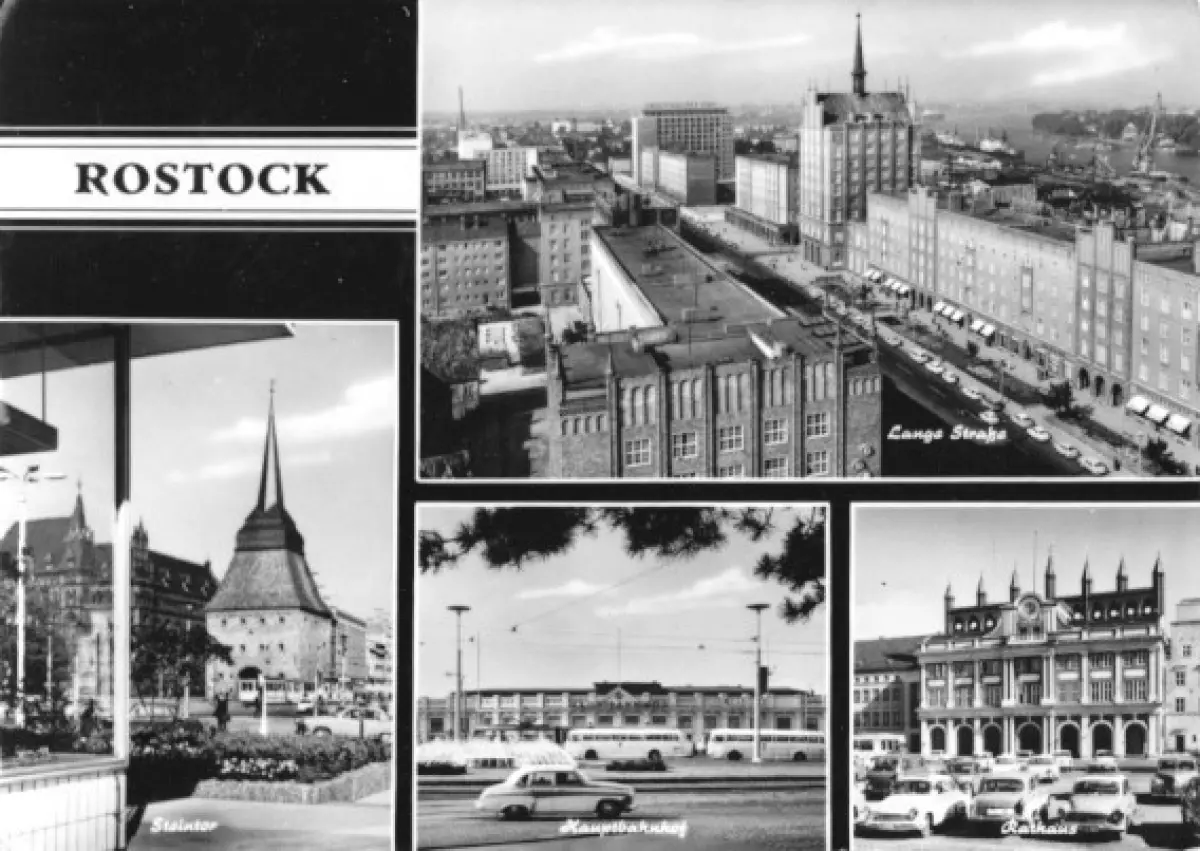 Ansichtskarte Rostock vier Abb., gestaltet - Lange Str., Steintor, Hauptbahnhof, Rathaus Erhaltung I-II Druckart: Fotokarte postalisch gelaufen, gestempelt: Berlin, 30.4.70 Druckvermerk: 1968 Herstellungsland: DDR Verlag: Graphokopie H. Sander, Berlin - G2495