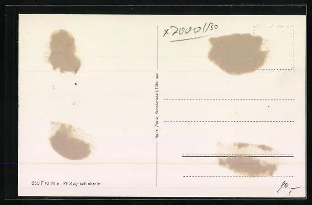Personenbezogene Daten auf der Rückseite der Karte wurden durch blauen Textmarker unkenntlich gemacht. Die blauen Stellen sind auf die Vorderseite durchgeweicht und wirken sich negativ auf das Postkartenfoto aus