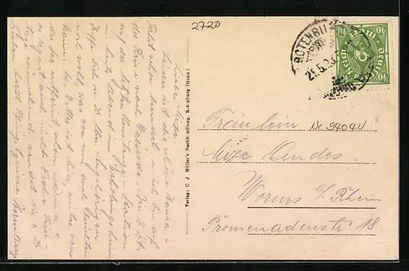 Personenbezogene Daten auf der Rückseite der Karte wurden durch blauen Textmarker unkenntlich gemacht. Die blauen Stellen sind auf die Vorderseite durchgeweicht und wirken sich negativ auf das Postkartenfoto aus