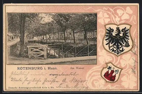 AK Rotenburg / Wümme, Partie am Wasser, Rahmen mit Wappen