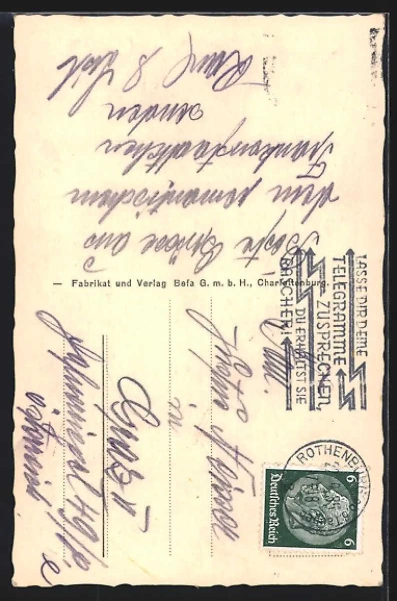 Personenbezogene Daten auf der Rückseite der Karte wurden durch blauen Textmarker unkenntlich gemacht. Die blauen Stellen sind auf die Vorderseite durchgeweicht und wirken sich negativ auf das Postkartenfoto aus