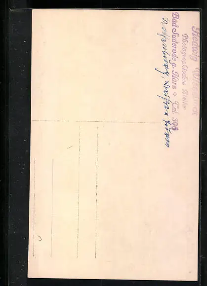 Personenbezogene Daten auf der Rückseite der Karte wurden durch blauen Textmarker unkenntlich gemacht. Die blauen Stellen sind auf die Vorderseite durchgeweicht und wirken sich negativ auf das Postkartenfoto aus
