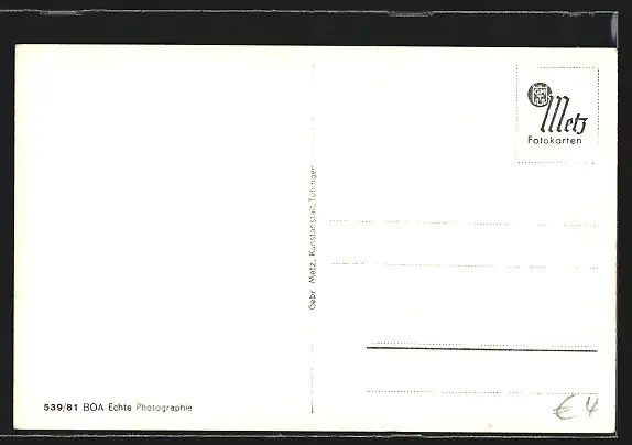 Personenbezogene Daten auf der Rückseite der Karte wurden durch blauen Textmarker unkenntlich gemacht. Die blauen Stellen sind auf die Vorderseite durchgeweicht und wirken sich negativ auf das Postkartenfoto aus