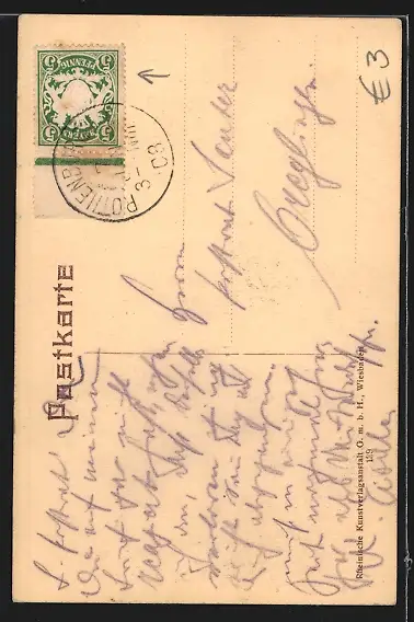 Personenbezogene Daten auf der Rückseite der Karte wurden durch blauen Textmarker unkenntlich gemacht. Die blauen Stellen sind auf die Vorderseite durchgeweicht und wirken sich negativ auf das Postkartenfoto aus