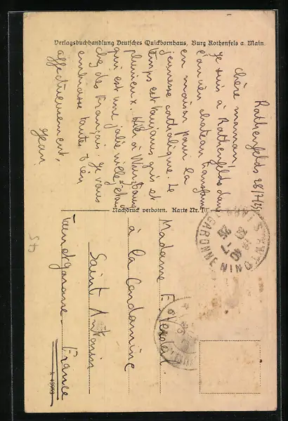 Personenbezogene Daten auf der Rückseite der Karte wurden durch blauen Textmarker unkenntlich gemacht. Die blauen Stellen sind auf die Vorderseite durchgeweicht und wirken sich negativ auf das Postkartenfoto aus