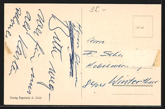 Personenbezogene Daten auf der Rückseite der Karte wurden durch blauen Textmarker unkenntlich gemacht. Die blauen Stellen sind auf die Vorderseite durchgeweicht und wirken sich negativ auf das Postkartenfoto aus