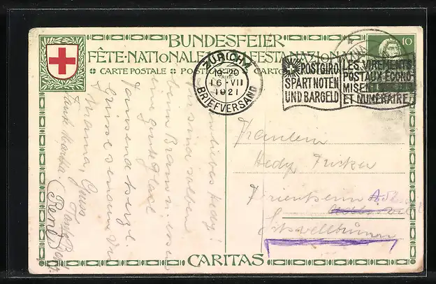 gelaufen 1921, Eckknicke li. unten und re. oben, guter Zustand