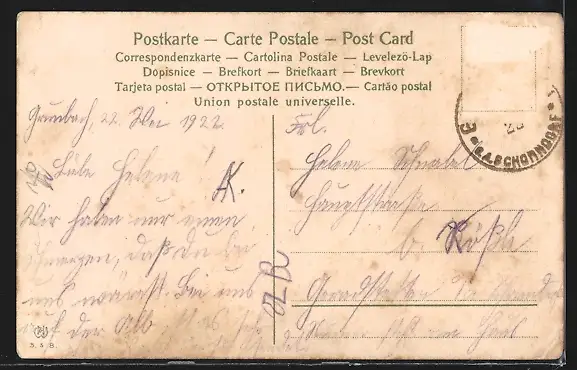 Personenbezogene Daten auf der Rückseite der Karte wurden durch blauen Textmarker unkenntlich gemacht. Die blauen Stellen sind auf die Vorderseite durchgeweicht und wirken sich negativ auf das Postkartenfoto aus