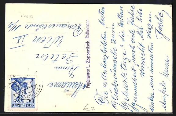Personenbezogene Daten auf der Rückseite der Karte wurden durch blauen Textmarker unkenntlich gemacht. Die blauen Stellen sind auf die Vorderseite durchgeweicht und wirken sich negativ auf das Postkartenfoto aus