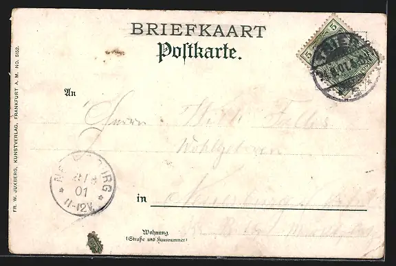 gelaufen 1901, Briefmarke entfernt, Eckknick li. unten, guter Zustand