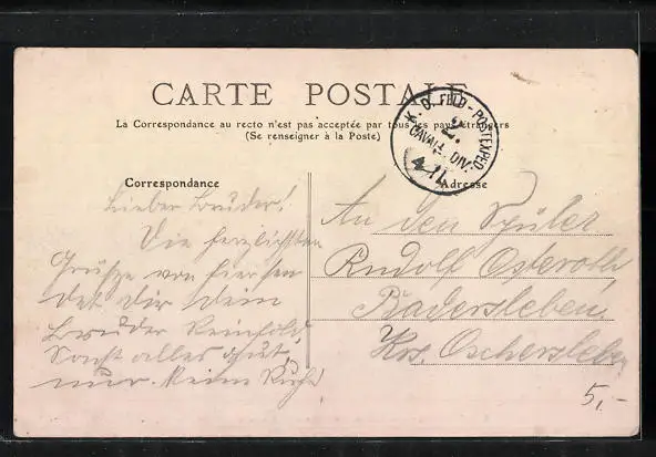 Personenbezogene Daten auf der Rückseite der Karte wurden durch blauen Textmarker unkenntlich gemacht. Die blauen Stellen sind auf die Vorderseite durchgeweicht und wirken sich negativ auf das Postkartenfoto aus