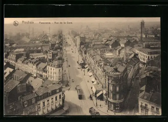 AK Roubaix, Panorama, Rue de la Gare, Strassenbahn