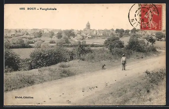 AK Rouy, Vue générale avec un homme et un chien sur un chemin