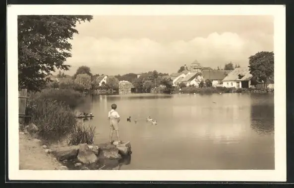 AK Rozmital p. Tr., junge am Ufer füttert die Enten