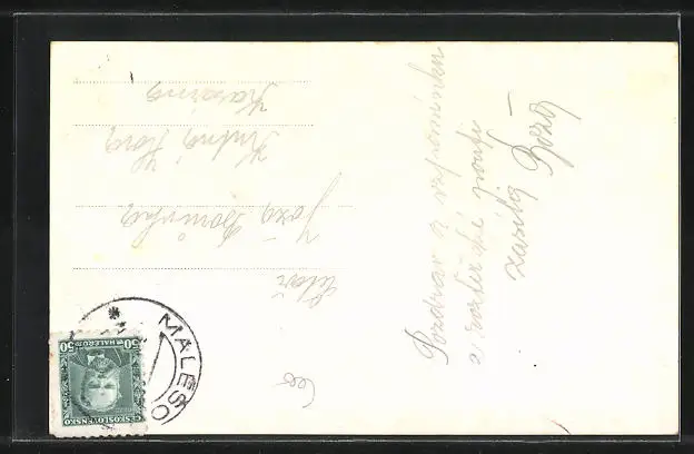 Personenbezogene Daten auf der Rückseite der Karte wurden durch blauen Textmarker unkenntlich gemacht. Die blauen Stellen sind auf die Vorderseite durchgeweicht und wirken sich negativ auf das Postkartenfoto aus