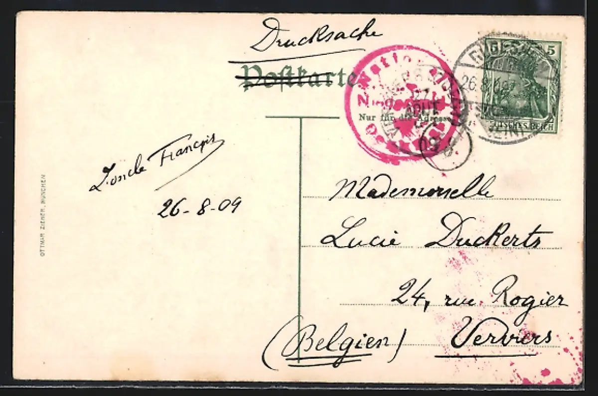 gelaufen 1909, Eckknick links und rechts oben, guter Zustand