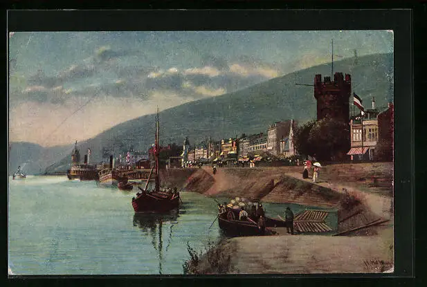 AK Rüdesheim a. Rh., Ufer mit Segelbooten