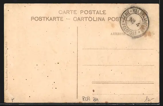 Personenbezogene Daten auf der Rückseite der Karte wurden durch blauen Textmarker unkenntlich gemacht. Die blauen Stellen sind auf die Vorderseite durchgeweicht und wirken sich negativ auf das Postkartenfoto aus