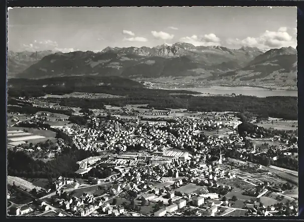 AK Rüti, Ortsansicht mit Blick in die Alpen, Fliegeraufnahme