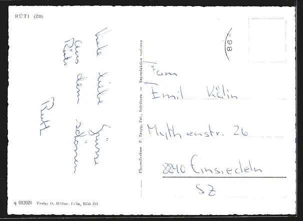 Personenbezogene Daten auf der Rückseite der Karte wurden durch blauen Textmarker unkenntlich gemacht. Die blauen Stellen sind auf die Vorderseite durchgeweicht und wirken sich negativ auf das Postkartenfoto aus