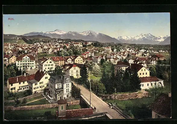AK Rüti, Teilansicht mit Bergkette aus der Vogelschau
