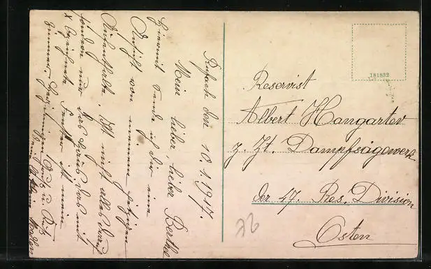 Personenbezogene Daten auf der Rückseite der Karte wurden durch blauen Textmarker unkenntlich gemacht. Die blauen Stellen sind auf die Vorderseite durchgeweicht und wirken sich negativ auf das Postkartenfoto aus