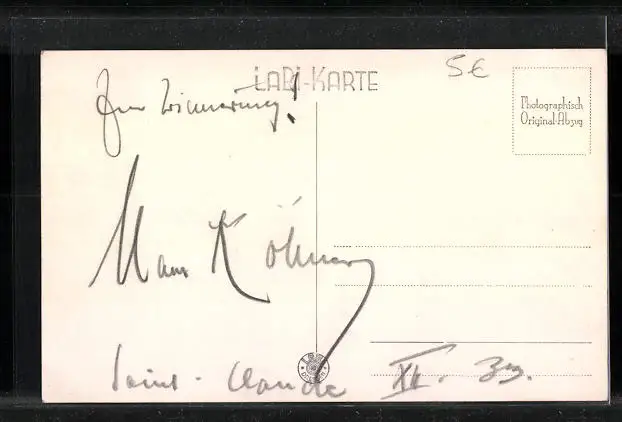Personenbezogene Daten auf der Rückseite der Karte wurden durch blauen Textmarker unkenntlich gemacht. Die blauen Stellen sind auf die Vorderseite durchgeweicht und wirken sich negativ auf das Postkartenfoto aus