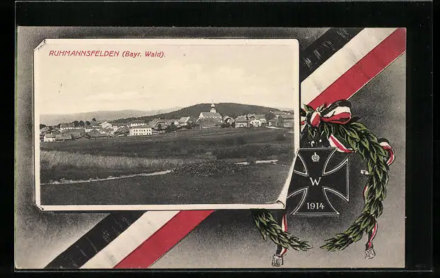 AK Ruhmannsfelden /Bayr. Wald, Ortsansicht mit Bergen