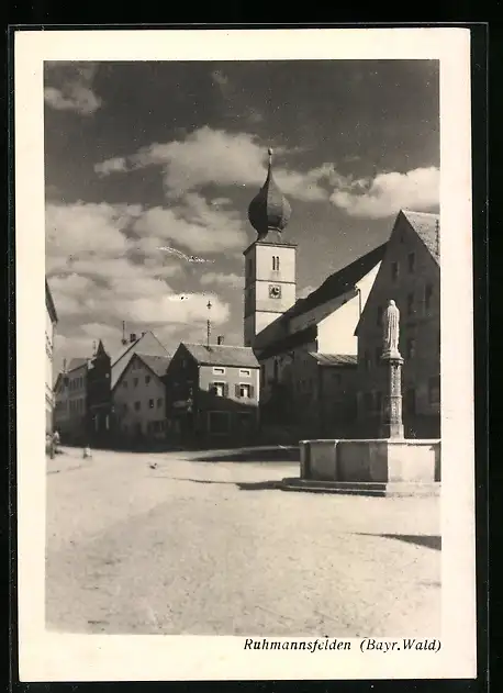 AK Ruhmannsfelden /Bayr. Wald, Strassenpartie mit Brunnen und Blick zur Kirche