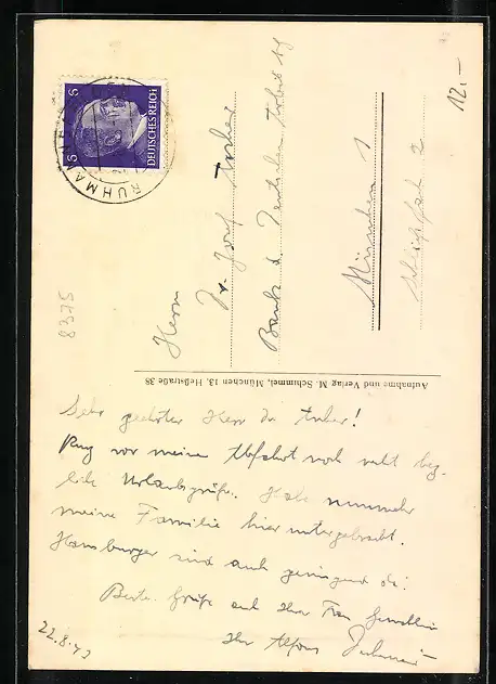 Personenbezogene Daten auf der Rückseite der Karte wurden durch blauen Textmarker unkenntlich gemacht. Die blauen Stellen sind auf die Vorderseite durchgeweicht und wirken sich negativ auf das Postkartenfoto aus
