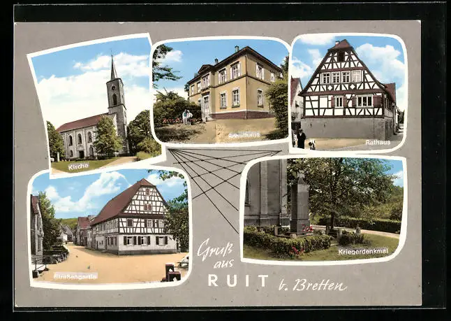 AK Ruit b. Bretten, Kirche, Schulhaus, Rathaus