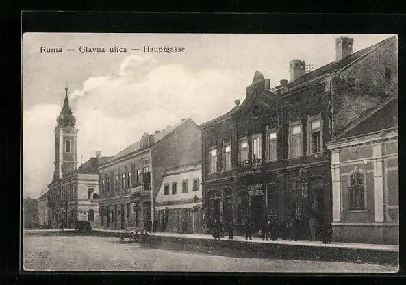 AK Ruma, Hauptgasse mit Mehlhandlung und Kirche