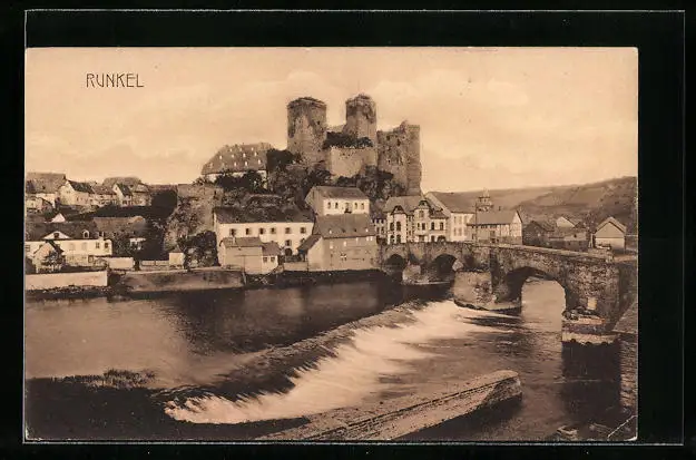 AK Runkel, Flusspartie mit Brücke