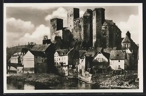 AK Runkel, Teilansicht mit Burg vom Wasser aus