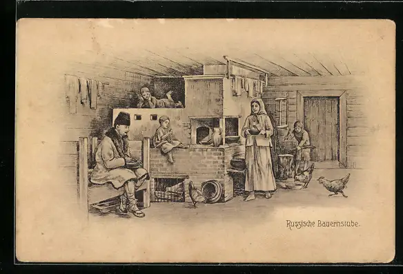 AK Russen am Ofen ihrer Bauernstube, Hühner