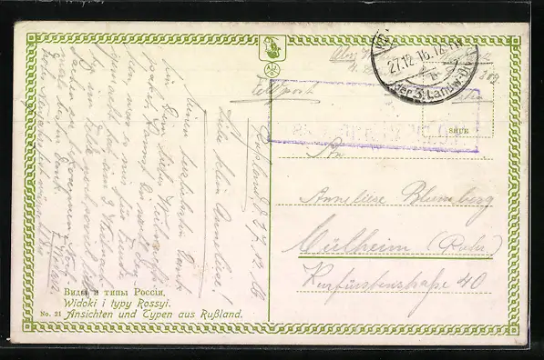 Personenbezogene Daten auf der Rückseite der Karte wurden durch blauen Textmarker unkenntlich gemacht. Die blauen Stellen sind auf die Vorderseite durchgeweicht und wirken sich negativ auf das Postkartenfoto aus
