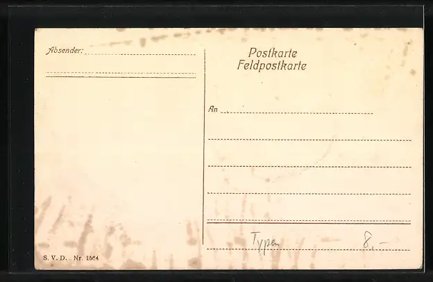 Personenbezogene Daten auf der Rückseite der Karte wurden durch blauen Textmarker unkenntlich gemacht. Die blauen Stellen sind auf die Vorderseite durchgeweicht und wirken sich negativ auf das Postkartenfoto aus