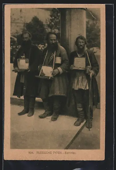 AK Russische Typen, Almosen-Sammler vor einer Kirche